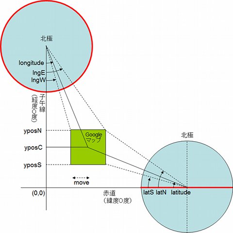 また、moveからlngWには、以下のように関数を設定しておきます。 メルカトル図法において、経度に関する計算は比較的簡単ですが、緯度に関する計算は難解です。まずは、こうやって計算できるものと考えてください。