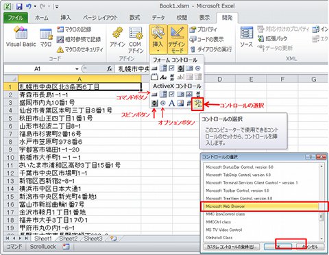スクロールダウンして、[Microsoft Web Browser]を選択し、[OK]をクリックすると、マウスポインタが十字型になるので、ワークシート上の表示させたい位置と大きさになるよう、ドラッグ&ドロップします。オブジェクト名は、WebBrowser1とします。