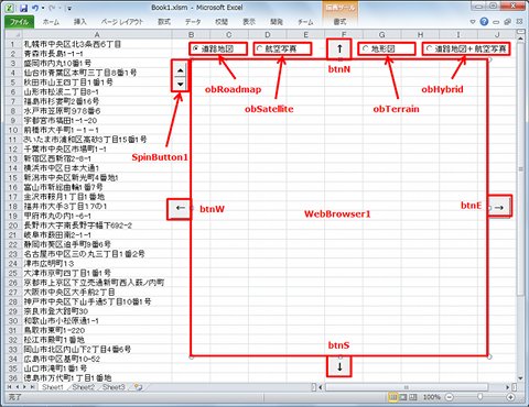 最後に、地図の種類を選択するオプションボタンを[ActiveXコントロール]の中の[オプションボタン]を使って、4つ配置します。