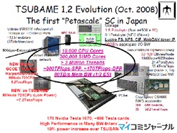 これに対して、TSUBMA1.2では、NVIDIAのGPUボード「Tesla 10」を680枚追加する。また、TSUBAME1.2では、TSUBASAとco-TSUMBAMEというそれぞれ90ノードのXeonブレードサーバクラスタが増設され、全体構成は図のようになる。