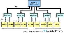 TSUBASAシステムと呼ぶXeonクラスタは、8ソケットのクワッドコアXeonブレード90枚からなるシステムで、8.2TFlopsの倍精度浮動小数点演算性能を持ってる。このTSUBASAは、5台の24ポートIBスイッチ経由でTSUBAMEのバックボーンに接続されている。