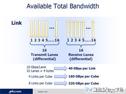 CPUとHMCの間のリンクは送受それぞれ16ペアの差動伝送の信号線があり、10Gbit/sの信号伝送を行うので、1本のリンクの送受合計の伝送バンド幅は40GB/sとなる。従って、リンク数が4本のHMCの場合は160GB/s、リンク数8本のHMCの場合は320GB/sのCPU-メモリ間伝送バンド幅が得られる。