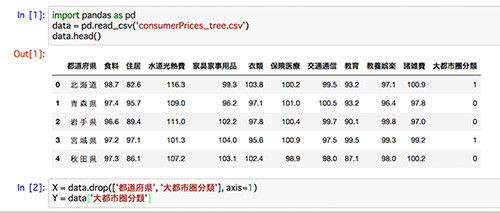 これまでと同様に、データを準備し、Jupyter Notebookを立ち上げてください。前回、すでに「consumerPrices_tree.csv」をダウンロードしてある方は、データの準備は必要ありません。Jupyter Notebookが立ち上がったら、右上のNewから、Notebookを開き、タイトル名を変更しておきましょう。今回は、ClassificationModelsという名前にしました。 まずは、これまでと同様に、データを読み込んでみます。