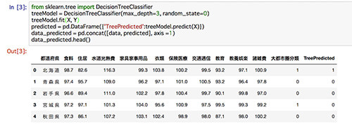 こちらの結果も先頭5行のみを表示しています。前回と同じ結果を確認できましたでしょうか。1行目で決定木の呼び出し、2行目でモデルの条件を指定しています。3行目で、教師データの学習を実行し、機械学習モデルを作成しています。