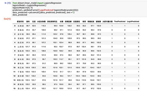 1行目で機械学習ライブラリscikit-learn(sklearn)のなかから、LogisticRegression、つまりロジスティック回帰を呼び出しています。2行目でlogisticModelという名前でロジスティック回帰を使う宣言をしています。決定木の場合は、モデルの条件を指定しましたが、今回はすべてデフォルトのものを使用するので、指定せずに定義しています。3行目で、先ほど宣言したモデルに教師データを代入して、学習を実行し、機械学習モデルを作成しています。決定木のときと同様に、「モデル名.predict(予測に用いる説明変数)」で、予測値を抽出できるので、logisticModel.predict(X)を4行目で抽出し、LogisPredictedという列名で保存しています。5行目で先ほどのデータに、LogisPredicted列を追加しています。