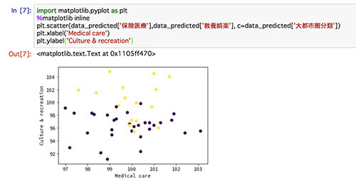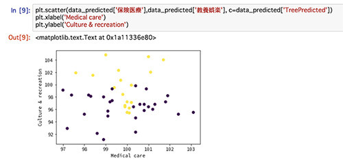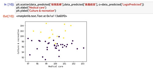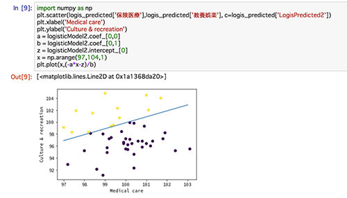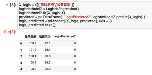 1行目で、説明変数として保険医療、教養娯楽の2変数を取り出しています。2行目以降は、先ほどと同様に、ロジスティック回帰のモデル定義から学習を行なっています。最後に、今回の予測結果を可視化するために、データを整えています。