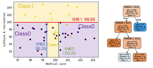決定木は、最もきれいに分割できる方法を探していきます。この場合、大都市圏であるClass1かどうかを最もきれいに分割する方法が、分岐1の教養娯楽が99.85以下かどうかです。99.85より大きい領域では、すべてClass1に分けられます。次に、保険医療が99.35以下かどうかでグラフの最も左側の領域をClass0として分けられます。さらに、保険医療が100.25より高い領域もClass0として分類しています。保険医療が100.25以下の領域は、Class0が4個、Class1が5個となり、精度が良い分類とは言えません。さらに階層を増やすことで、きれいに分割することはできますが、過学習に注意しなくてはなりません。