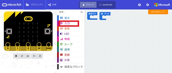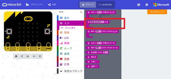 左側にはマイクロビットの画像があり、ここでプログラムのシミュレートを行うことができます。マイクロビットの図の右側にはカテゴリがあります。基本や入力、音楽などカテゴリに分かれており、クリックすることでブロックが表示されます。「…さらに表示」のボタンをクリックすると、さらに該当するカテゴリのブロックが表示されます。
