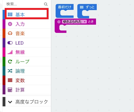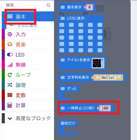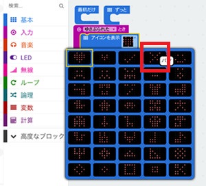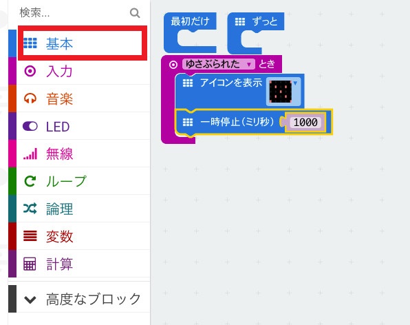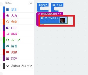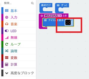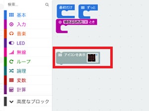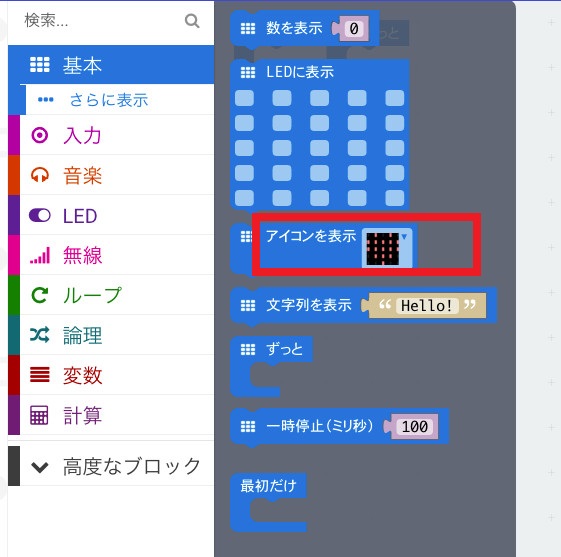 次にLEDに×を表示するためにアイコンのブロックを追加します。カテゴリから「基本」をクリックします。「アイコンを表示」のブロックをクリックします。