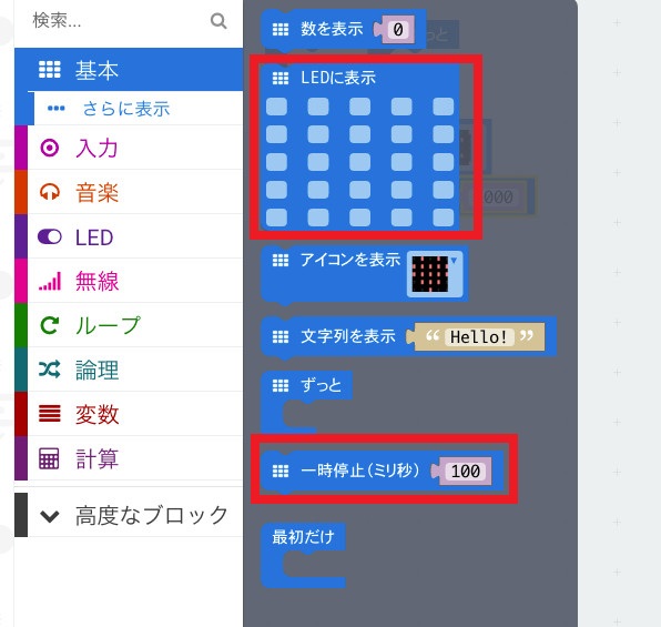 ブロックが追加されたら「LEDに表示」ブロックを「一時停止(ミリ秒)」のブロックの下につなげます。