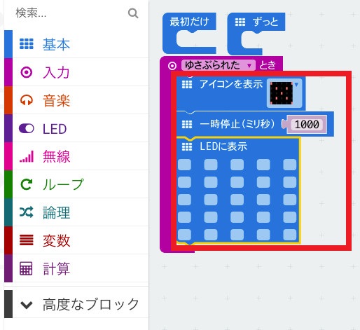 ブロックが追加されますが、このままでは機能しません。グレーっぽくなっているブロックは機能しないことを示しています。「アイコンを表示」ブロックを「ゆさぶられたとき」のブロックの中にドラッグします。すると、ぴたっとくっつきます。これでブロックが機能するようになります。
