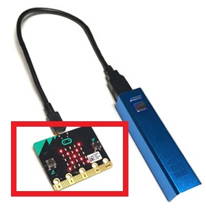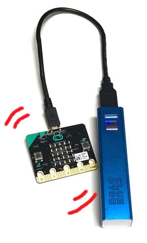 動作を確認できたらモバイルバッテリーと接続して持ち運んでみましょう。マイクロビットを手に持って揺らすとLEDに×が表示されるはずです。