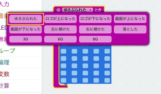 カテゴリから「入力」をクリックします。「ゆさぶられたとき」のブロックをクリックします。
