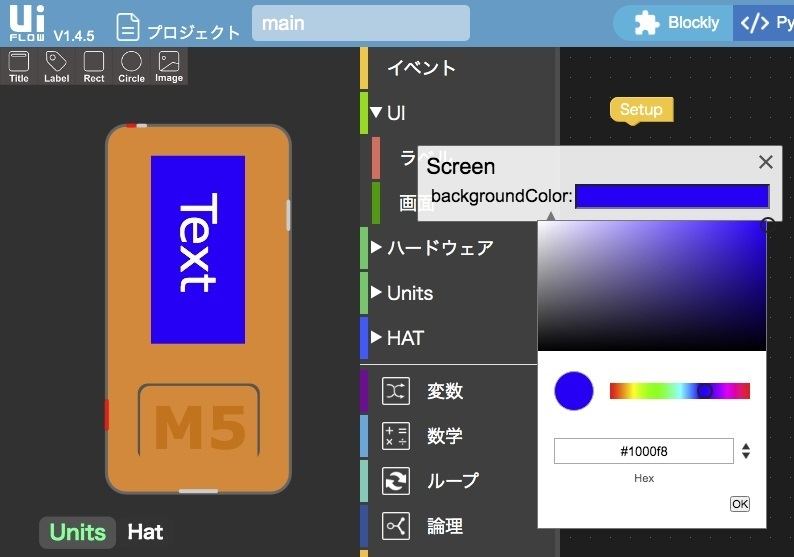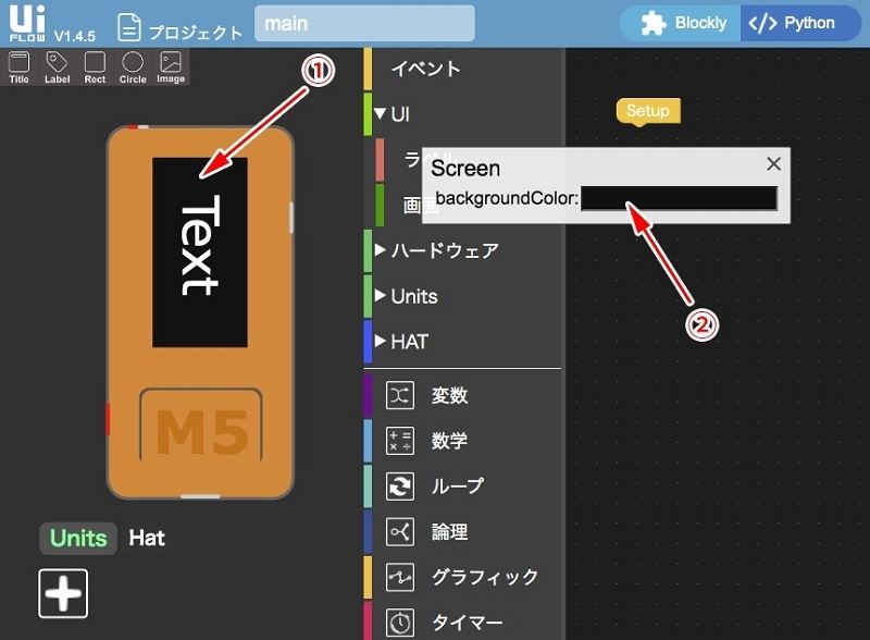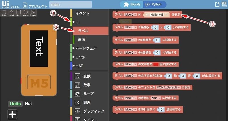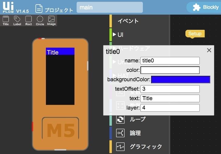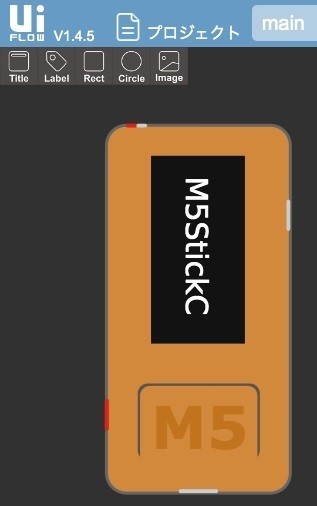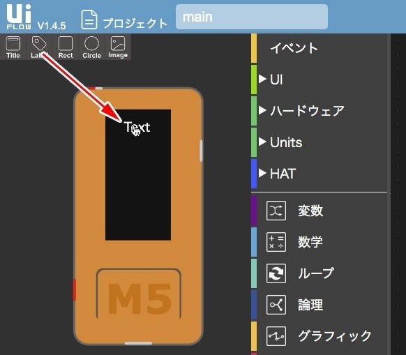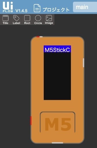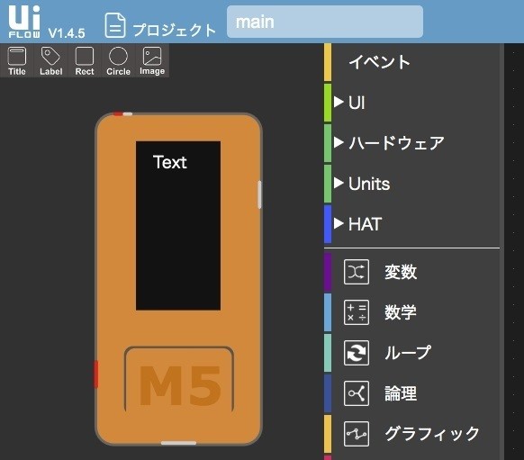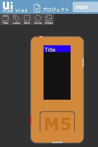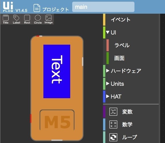 M5StickCでは2種類の文字を扱うことができます。1つはタイトルなどに使用するタイトルテキスト、もう1つがラベルテキストです。UIFlow画面の左上にTitle、Label、Rect、Circle、Imageと書かれた文字とアイコンがあります。