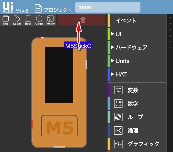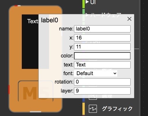 タイトルテキストを削除したらラベルテキストを配置します。ラベルテキストは画面左上にあるLabelと書かれたアイコンをM5StickC画面上までドラッグドロップします。やり方はタイトルテキストと同じです。
