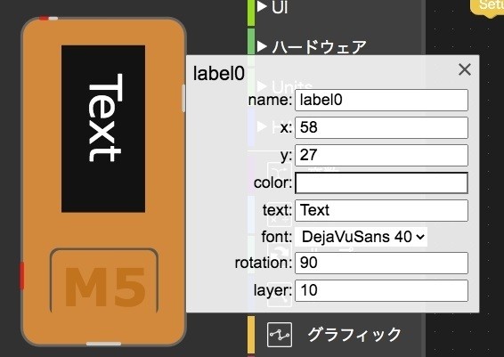 タイトルテキストは配置場所が決まっており自由度が高くありません。M5StickC画面上に自由に文字を配置するにはラベルテキストを使います。