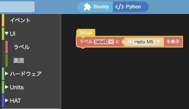 配置するブロックはUIカテゴリ内のラベルの項目をクリックすると表示されます。ラベルテキストに文字を表示するブロックは一番上にあります。このブロックをクリックします。