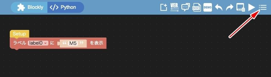 それでは実際にM5StickCで実行してみましょう。M5StickCで実行するにはUIFlow画面右上にある▲のボタンをクリックします。