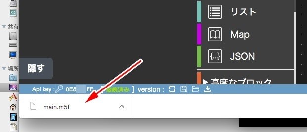 簡単なプログラムでしたが、せっかくなので保存しておきましょう。UIFlowではJSON形式でプログラムが保存されます。ブロックのコードはJSON形式内にXMLテキスト(単なる文字列)として保存され、拡張子はm5fになります。