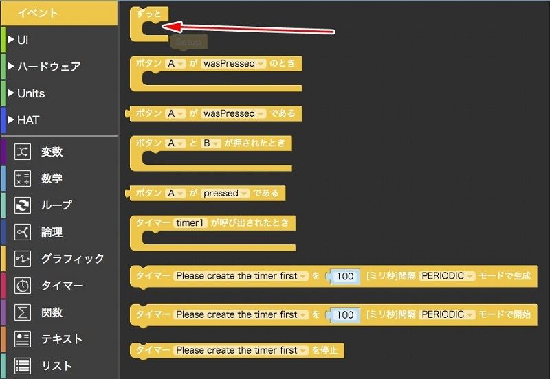 「ずっと」のブロックを「Setup」のブロックにつなげます。