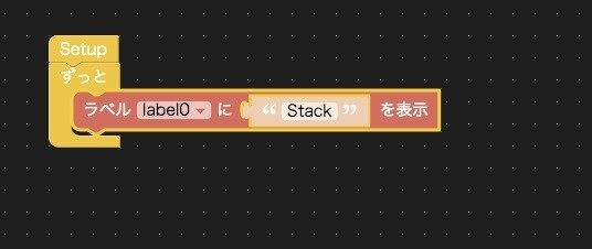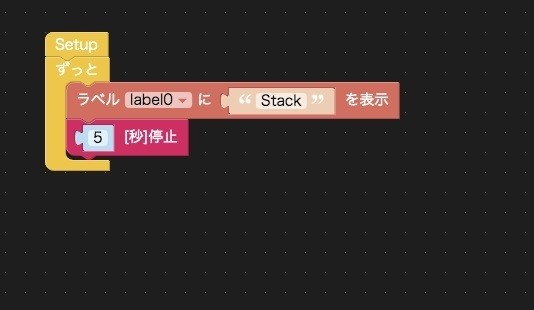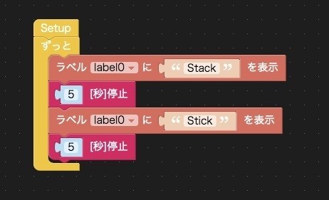 それでは最後に5秒ごとに文字を切り替えるプログラムを作成します。ここでは切り替える文字をStackとStickにします。まず、図で示すボタンをクリックします。