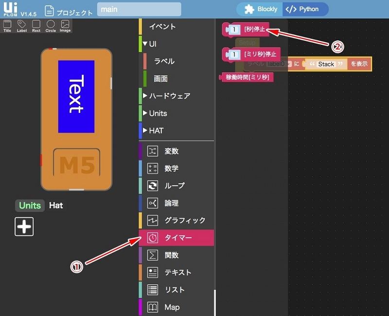 UIFlowのブロックエディタを使ったプログラムのおおまかな流れが分かれば十分です。ブロックを配置するだけで高機能なM5StickCを扱えるのは大変便利です。ブロックエディタを使っていろいろ試してみるとよいでしょう。
