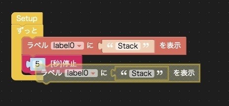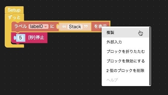 するとブロックが複製されます。このブロックを「[5]秒停止」ブロックの下につなげます。つなげたら表示する文字を変更します。