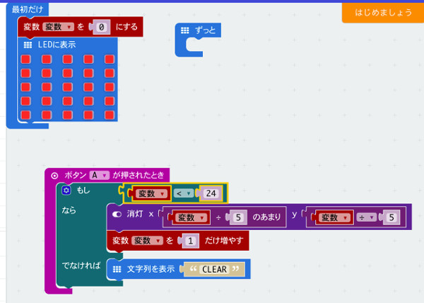 ã5ã¯ãã€ã¯ããããã®LEDã®çžŠæšªã®æ°ã§ãããã€ã¯ããããã®LEDæ°ã¯æšª5Ã瞊5ãªã®ã§ããã®ãããªèšç®ã«ãªããŸãããã®ããã«èšç®ãã座æšãæ¶ç¯ãããã¯ã«èšå®ããŸããæ¶ç¯ããåŸã«ã¯ã倿°ãã®å€ã«1ãè¶³ããŸãã ãã倿°ãã®å€ã24æªæºã§ããã°è©²åœãã座æšã®LEDãæ¶ç¯ããããã§ãªãå Žåã¯ã²ãŒã ãã¯ãªã¢ããããšã«ãªãã®ã§CLEARã®ã¡ãã»ãŒãžã衚瀺ããŸãã ããããŸã§ã®ãããã¯ãçµã¿ç«ãŠããšä»¥äžã®ããã«ãªããŸãã
