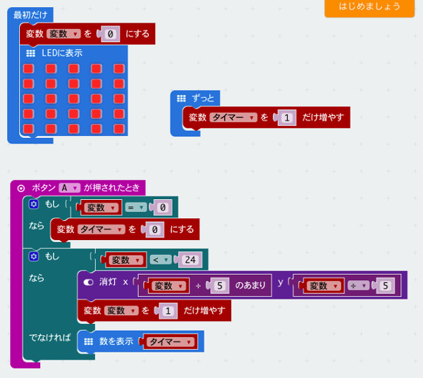 ãAãã¿ã³ãæŒããããLEDãæ¶ãã ãã®ã²ãŒã ã§ããããªãã¹ãã·ã³ãã«ã«ãããã䜿çšãã倿°ã¯2ã€ã ãã«ããŸãã1ã€ã¯LEDãæ¶ãããã®äœçœ®ã瀺ã倿°ã§ãããã1ã€ã¯ã²ãŒã ã¯ãªã¢ãŸã§ã«ããã£ãæéãèšæž¬ãã倿°ã§ãã ããŸããAãã¿ã³ãæŒããããLEDãæ¶ãéšåãäœæããŸããæåã«ã倿°ãã0ã«ããŠLEDãå šç¹ç¯ãããŸãããLEDã«è¡šç€ºããããã¯ãé 眮ãããšå šæ¶ç¯ã«ãªã£ãŠããã®ã§ãLEDéšåãã¯ãªãã¯ããŠèµ€ãããŸãã25åãã¹ãŠã®LEDãç¹ç¯ãããŠãããŸãã