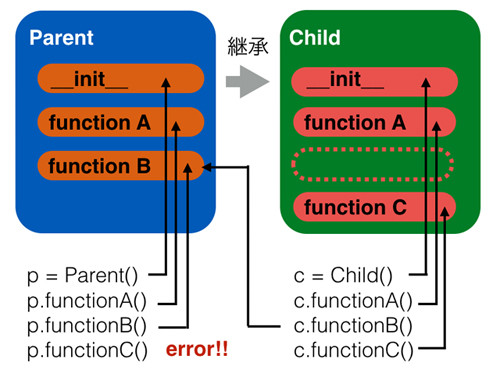 見てもらうとわかりますが、子クラスで再定義したメソッドは子クラスのものを呼び出し、再定義していない場合は親クラスのメソッドを呼び出します。当然ながら、子クラスだけしか持たないメソッドを親クラスのインスタンスは呼び出せません。