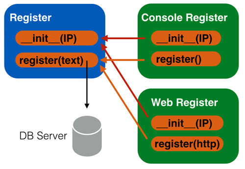 Console Registerクラスはコンソールへの入力をデータベースに登録し、Web RegisterはHTTPからの入力をデータベースに登録します。ただ、その登録自体は親クラスのメソッドを利用するという形式です。