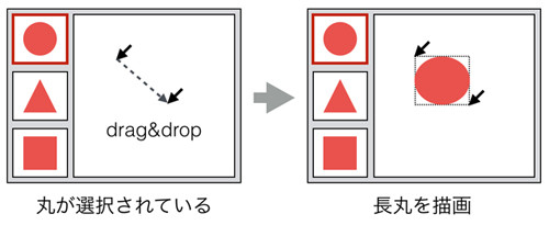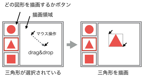 以下の図を見てください。これは図形を描画する簡単なGUIアプリケーションの画面とします。左側のボタンで選択された図形が、右側の描画領域でドラック開始からドラッグ終了ポイントまでの大きさで描画されます。