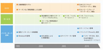 また、現在のO2Oの活況に至るまでの流れの中で忘れてはならないのは「おサイフケータイ」の登場である。NTTドコモは2004年6月にFelica対応端末を発売し、スマートフォンが登場するまで、日本独自の進化を続けたフィーチャーフォンの主要機能の1つであった。用途はクレジット決済、ポイントカード、電子マネー、チケット発券とさまざまであったが、その中で店舗送客の領域において活用されたのがクーポン利用である。