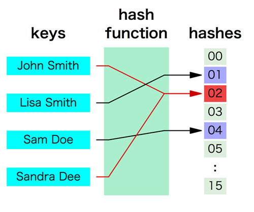 この問題を防ぐためにハッシュ値の範囲は十分な広さを持たせる必要があります。たとえば今回のように00から15などという範囲は狭すぎるので、これをもっと広げます。そうすると確率的には衝突は発生しにくくなります。まぁ、普通はこんなことを気にしなくてもPythonがよしなに処理してくれるので大丈夫です(笑)。