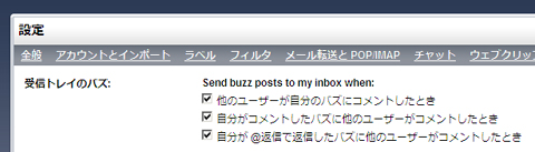 Google Buzzは、自身のBuzzにコメントがついた際などにGmailの受信トレイに新着メッセージとして通知する仕様となっている。Buzzを頻繁に利用するユーザーは多くの新着通知を受け取ってしまうが、今回追加された設定によって、受信トレイに通知するコメントのルールを指定できるようになる。設定は、自身のBuzzにコメントがあった場合/ 自身がコメントを入れたBuzzに他のユーザーがコメントした場合/ @返信したBuzzに他のユーザーがコメントした場合の3種類を用意した。また、Buzzの受信通知を受け取った場合は、メッセージ上部にその理由が添えられるようになっている。
