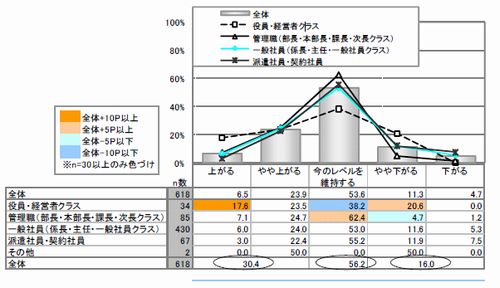 2011年のモチベーションの増減を聞いた質問では、「今のレベルを維持する」との回答が54%と最も多く、「上がる」と答えた人は30%だった。役職別では、「役員・経営者クラス」の41%がモチベーションは「上がる」と答えているが、「管理職」は「現状維持」が62%と最も多く、「上がる」人は32%だった。