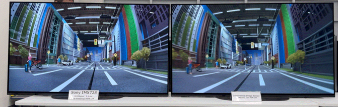 前出のソニーセミコン「IMX728」と従来型センサーを積んだ小型カメラによる、暗所でのデモの様子。照明がそれなりにある場所では、IMX728を積んだカメラでは道路を横断中の人をはじめ、さまざまな被写体を捉えているが、従来型センサーではごく一部の明部しか捉えられていない