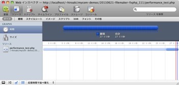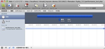FMFindAny()のみをおこなうPHPファイルを作成し、projectレイアウトとproject_allにアクセスして時間を計測する。計測にはSafariのWebインスペクタをもちいた。まずは正常に動作しているパターンから。