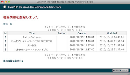 一覧画面(books/index)でdeleteAllの動作を確認する。