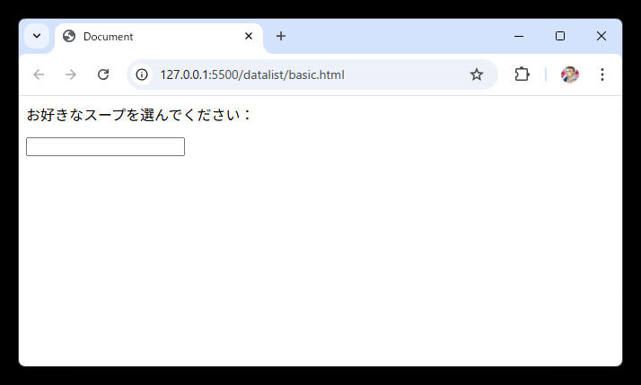 datalistの基本的な使い方として、テキスト入力ボックス(input type="text")とdatalistを組み合わせた例を紹介します。input要素にlist属性を付与して、対応するdatalistを指定します(リスト1)。