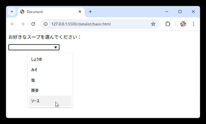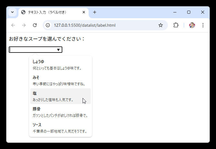 <label for="noodle-soup">お好きなスープを選んでください:</label>