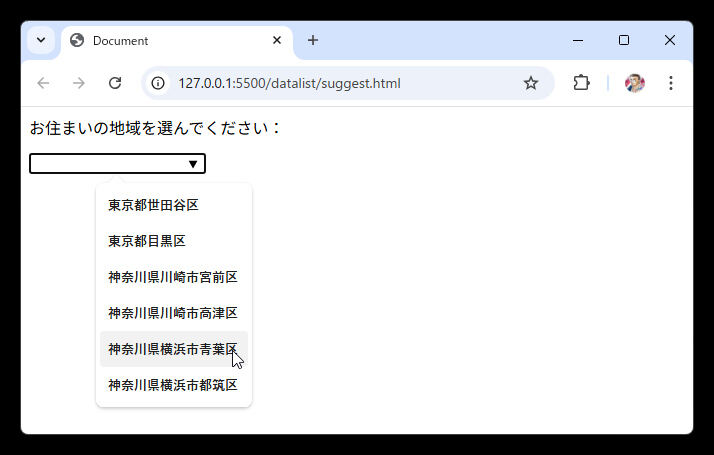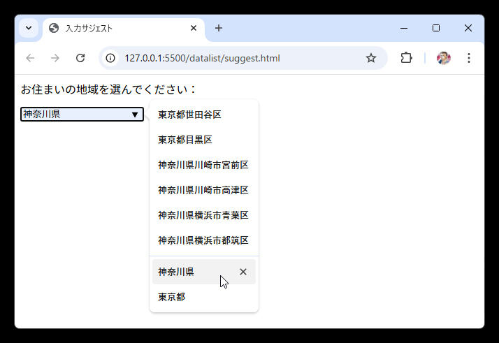 なお、リスト以外のもの(例えば「東京都」「神奈川県」など)を入力すると、それも合わせて次回からリストに表示されるようになります(図3)。datalistとブラウザのオートコンプリート機能が合わさったものといえます。