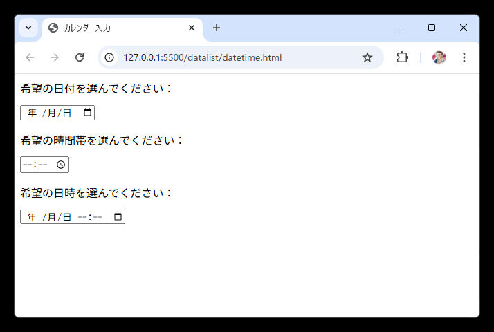 ページを表示させると、まずは日付入力ボックス、時刻入力ボックス、日付時刻入力ボックスが表示されます(図5)。