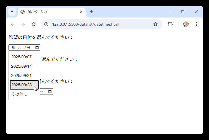 日付入力ボックス右端のカレンダーアイコンをクリックすると、datalistで指定した日付と[その他...]が表示されます(図6上)。日付を選択すればその日付が入力され、[その他...]を選択すると通常のDateピッカーが表示されます(図6下)。