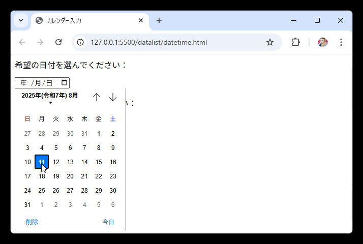 ここではtypeがdate、time、datetime-localである場合の例を示していますが、同じくカレンダー情報を入力できるmonth、weekの各typeにおいても適用可能です。