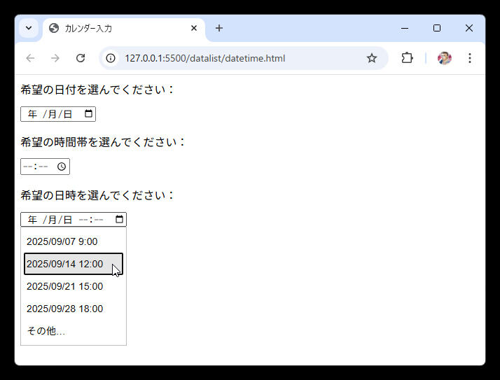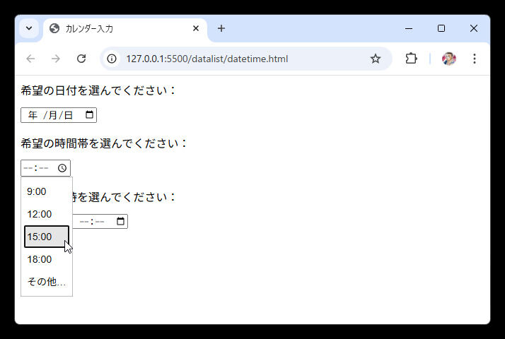 datalistが本領を発揮するのは、ここで示すカレンダー入力など、手入力が面倒なものです。もちろん、input要素だけでもDateピッカーやTimeピッカーなどが備わっており、それを使えば日付と時刻の入力は選択するだけで済みます。しかしながら、特定の日時だけを選択させるという用途には向きません。datalistを使うと、3時間おきの時刻を選択させたり、今後1ヶ月間の日曜日などを選択させることができます。