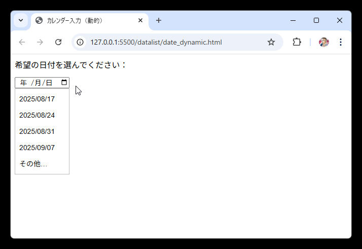 最後に(3)で、日曜日の配列をもとにdatalist要素へoption要素を追加しています。