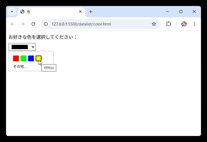 リスト8は、赤(#ff0000)、緑(#00ff00)、青(#0000ff)、黄(#ffff00)の4色を直接選択可能にして、その他の色はColorピッカーで選択する例です。