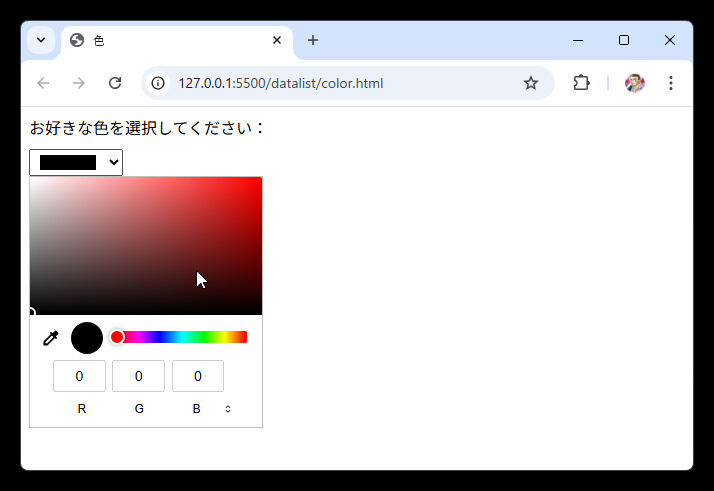 カラー入力も、datalistが生きる入力要素と言えます。標準のColorピッカーで直接RGBカラーを選ばせるのは選択肢が膨大になり、選ぶ方にとっても負担になるものです。あらかじめ対象の色が決まっていれば、それを選択させた方が選ぶ方の負担は少なくて済むでしょう。