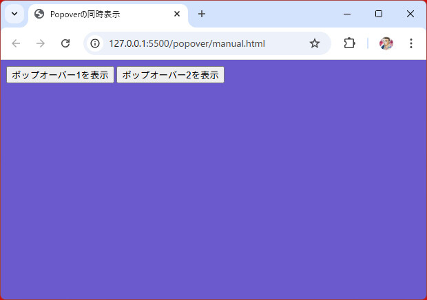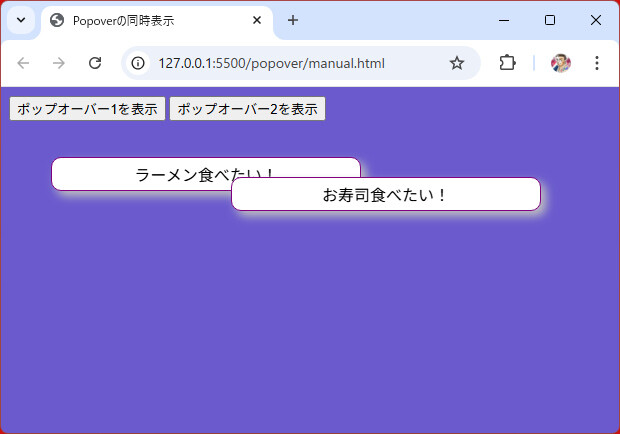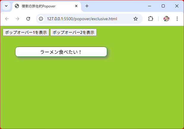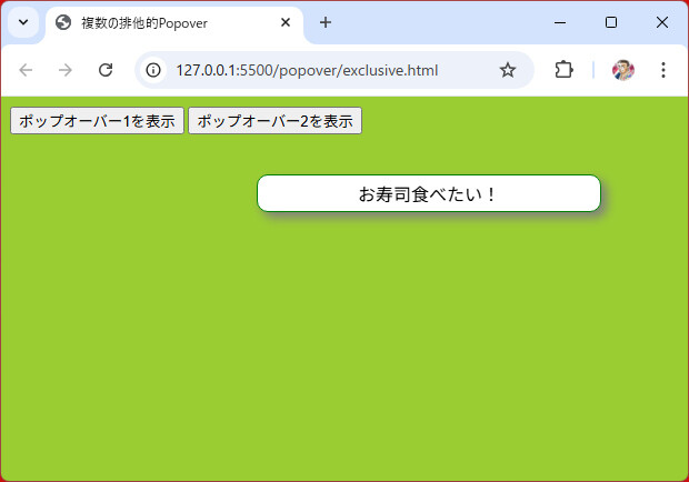 ここまではポップオーバーを一つだけ表示させてきましたが、トリガー要素とポップオーバー要素の組み合わせを複数個、置くことができます。既定(popoverまたはpopover=""またはpopover="auto")では、あるポップオーバーが開いているときに別のポップオーバーを開くと、開いていたポップオーバーは閉じます。つまり、排他的な動作となります(リスト5)。